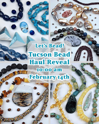 We are back from our Arizona bead-buying trip to the Tucson Gem Show! Our Tucson Grand Bead Reveal is set for February 14th at 10am (Valentine's Day!) The Reveal is in-store only 10am-4pm. (In time, we expect to get some of the new treasures up for online sale here at LetsBead.com)